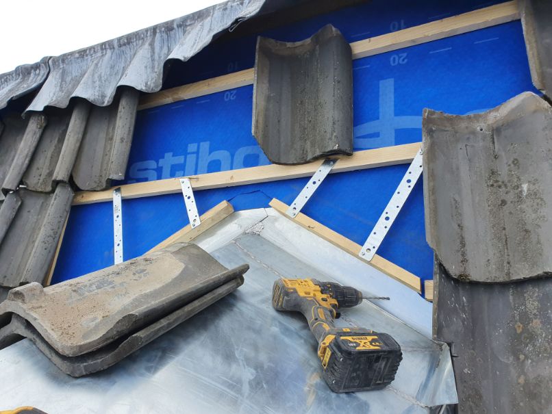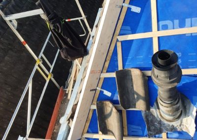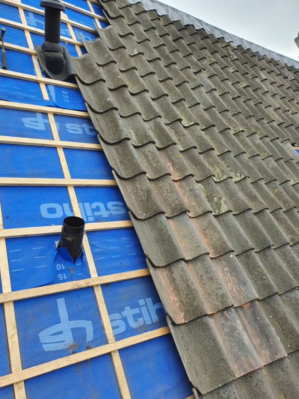 Op de hoek van de Haarlemmerstraat en Herenmarkt in Amsterdam hebben we een dakrenovatie uitgevoerd. De oude holle dakpannen zijn eerst verwijderd. Vervolgens is er damp open dakfolie, nieuwe stof en panlatten geplaatst en zijn de zinken goten rondom vervangen. Daarna hebben we de dakpannen teruggeplaatst inclusief stormhaken van rvs.